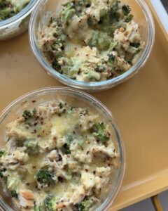- In an oven-safe bowl, mix together chicken, cauli rice, corn, beans, salsa, & seasonings. Top with cheese.