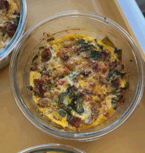 - Crack eggs into oven-safe container (the one’s I’m using are 6-cup glass), then add the rest of your ingredients, aside from grated Parm cheese.