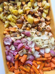 - Mix chicken, vegetables, & your seasoning mixture together in a large bowl, or right on your baking pan.