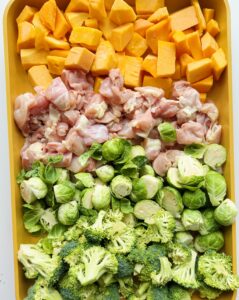 - Slice Butternut squash, broccoli, and chicken into medium chunks.