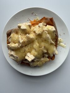 4. Slice potato in half, add on chicken mixture & top with cheese.