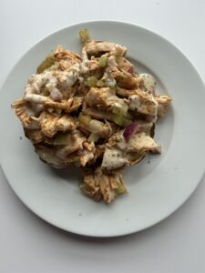 5. Slice potato in half, add on chicken mixture, top with ranch.