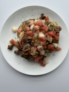 4. Slice potato in half, add on cottage cheese, ground beef, diced avocado, & honey.