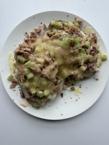5. Slice potato in half, add on tuna mixture, top with cheese.